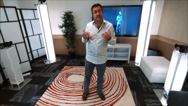 “如果對象是一個小女孩的話,她的全息影像就這樣被捕捉下來,通過互聯網傳輸到她的父親面前,她的父親就可以看到她的學習影像,可以自如跟這個女孩交互、對話、做游戲、甚至可以虛擬的擊掌、握手乃至擁抱。”